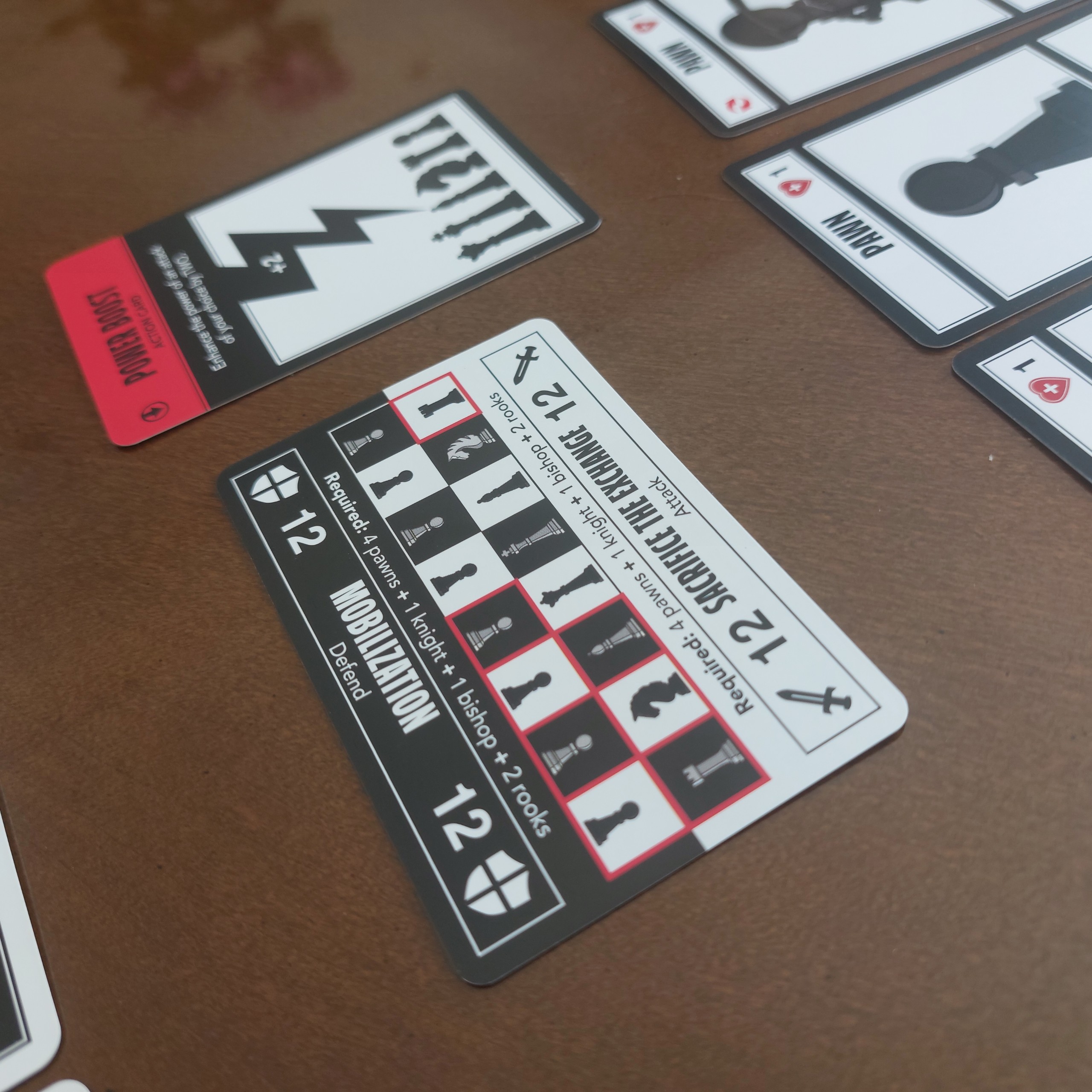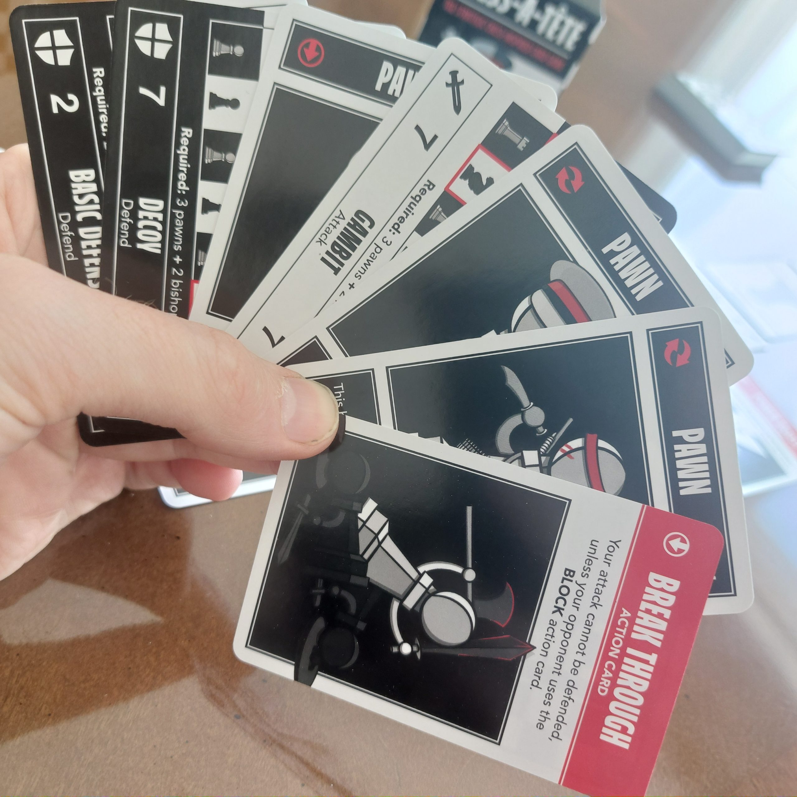 Action cards are often a reaction, and generally require you to have certain pieces in your army to be able to play and resolve them. Whilst you can only play one attack card per turn, these are the crux of the game and ultimately your path to victory, although attack cards are also defend cards, so you’ll need to balance playing attack cards and then keeping some attack cards to use them for their defense ability.