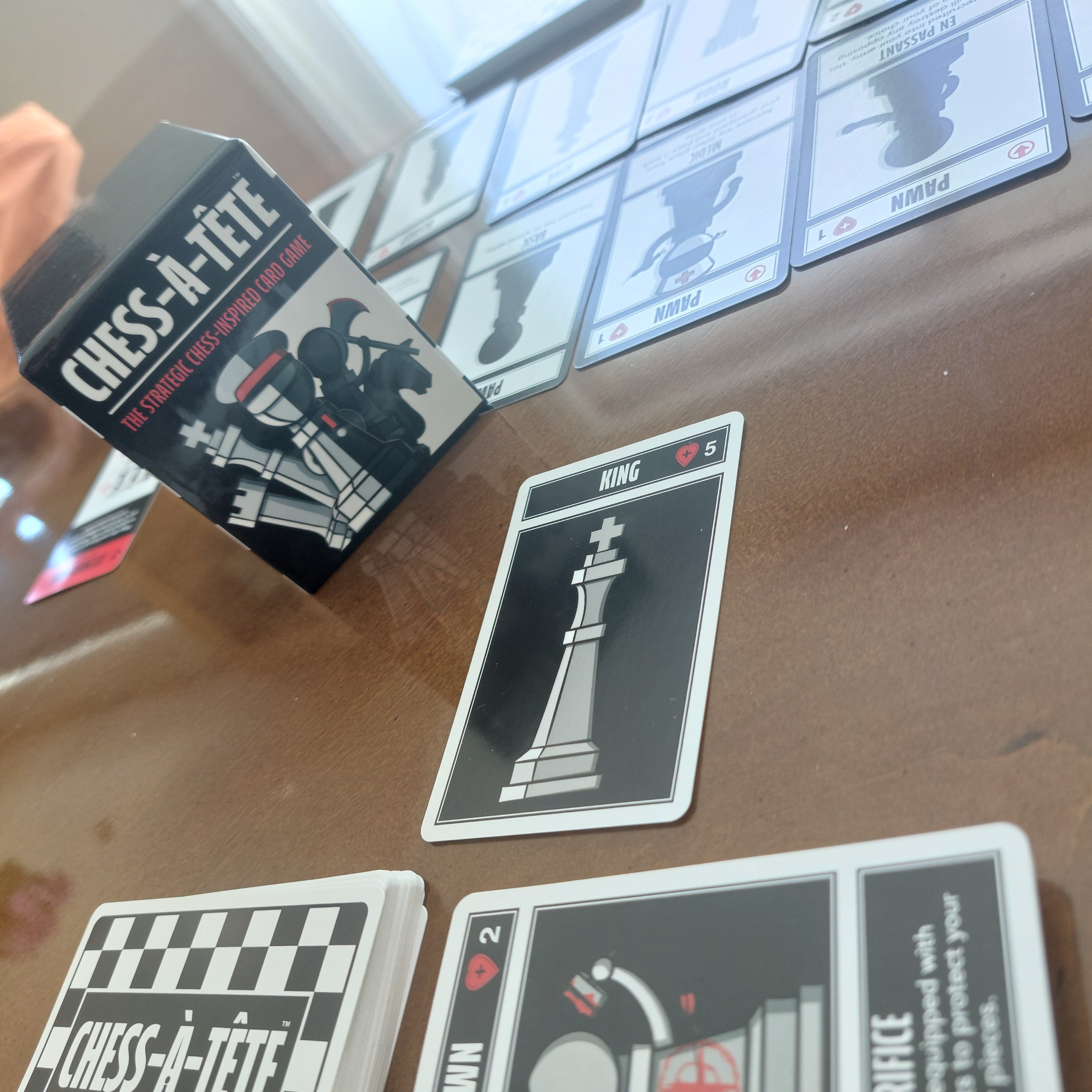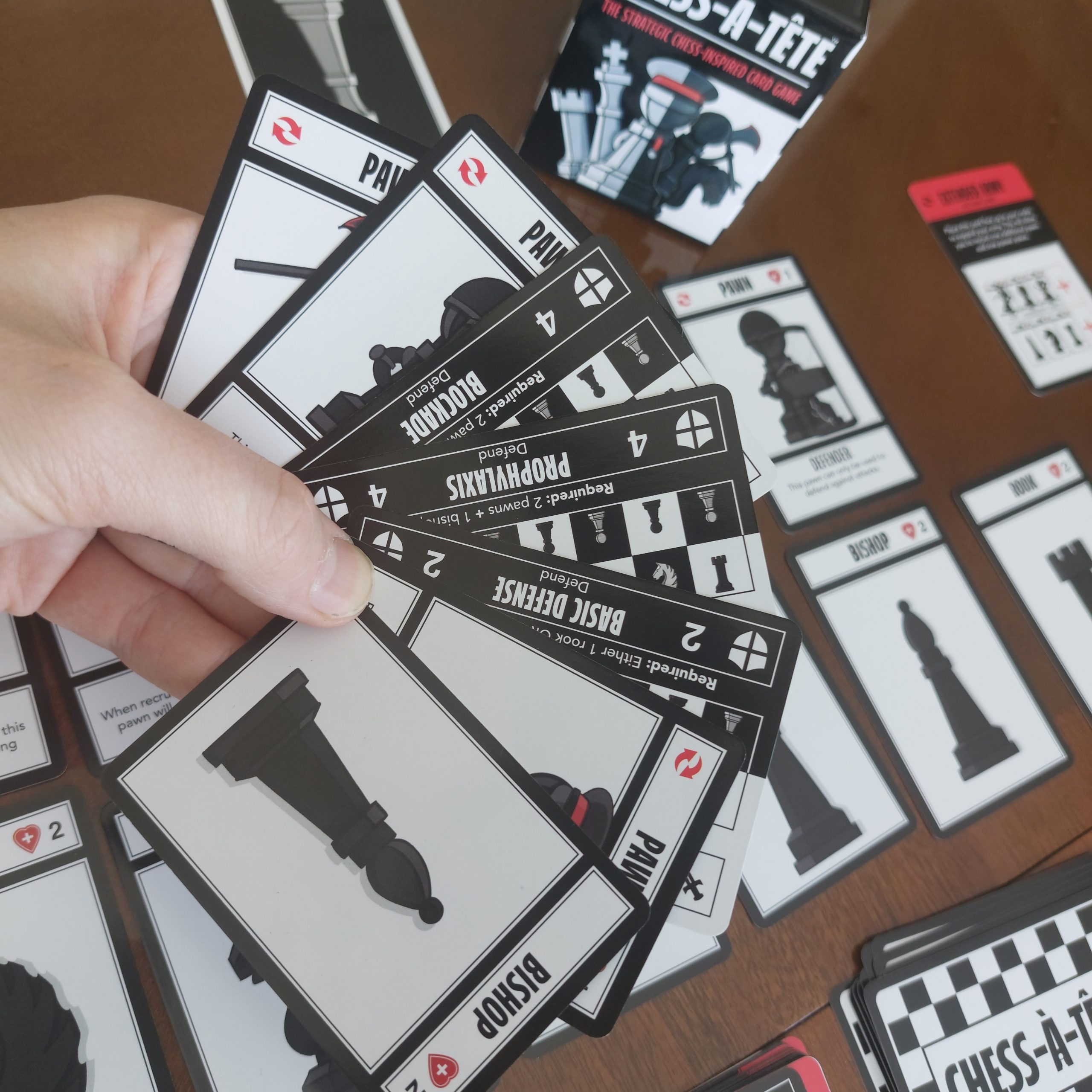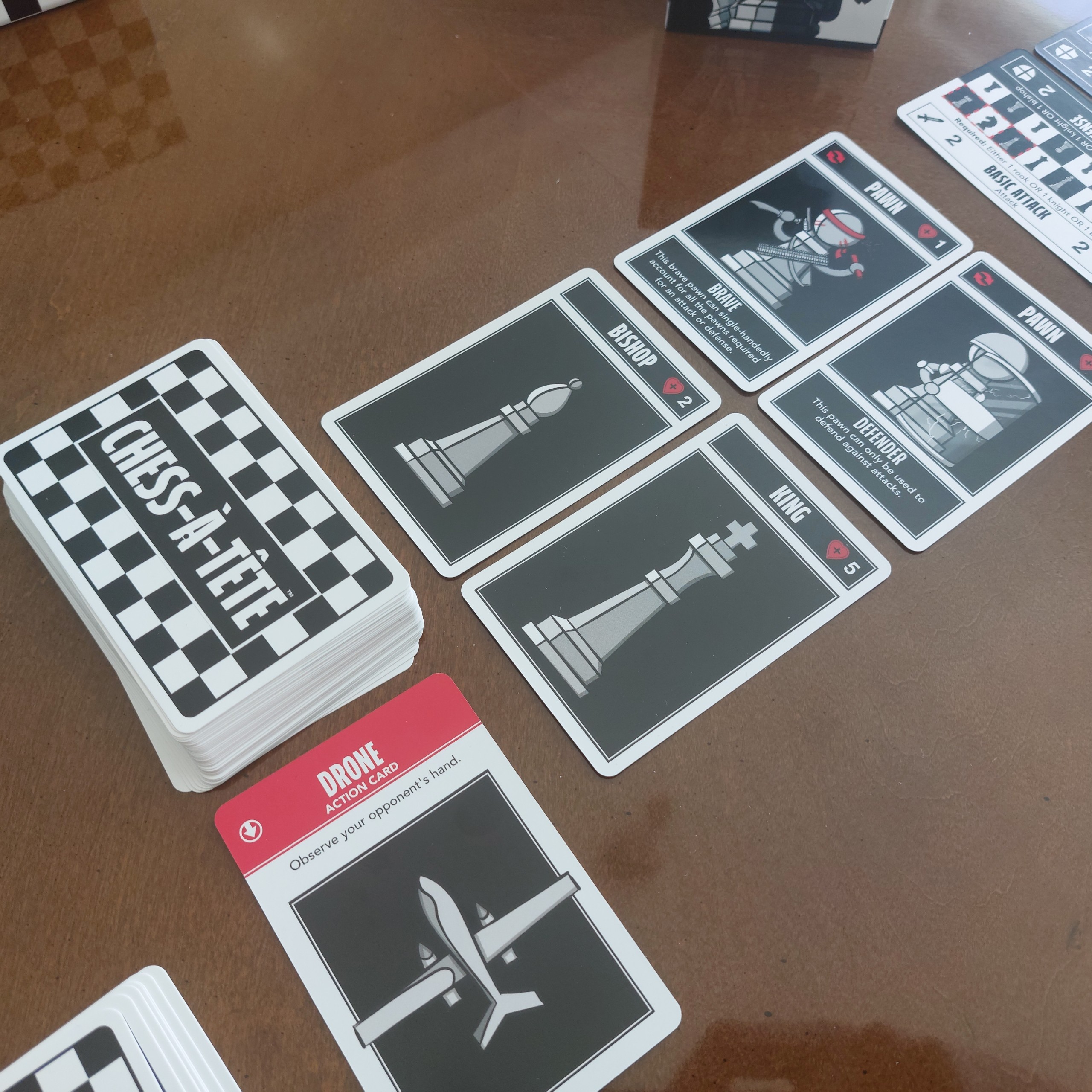 Chess-a-tete is a two player essentially built around Chess, but it’s not, if that makes sense. Fundamentally if you’ve played Chess, you’ll instantly recognise the pieces and it’ll feel familiar, but equally it won’t. The aim of Chess-a-tete is to capture your eliminate your opponents King or lay a complete army and then play your checkmate card. Or if you run out of cards in your draw deck, you lose!