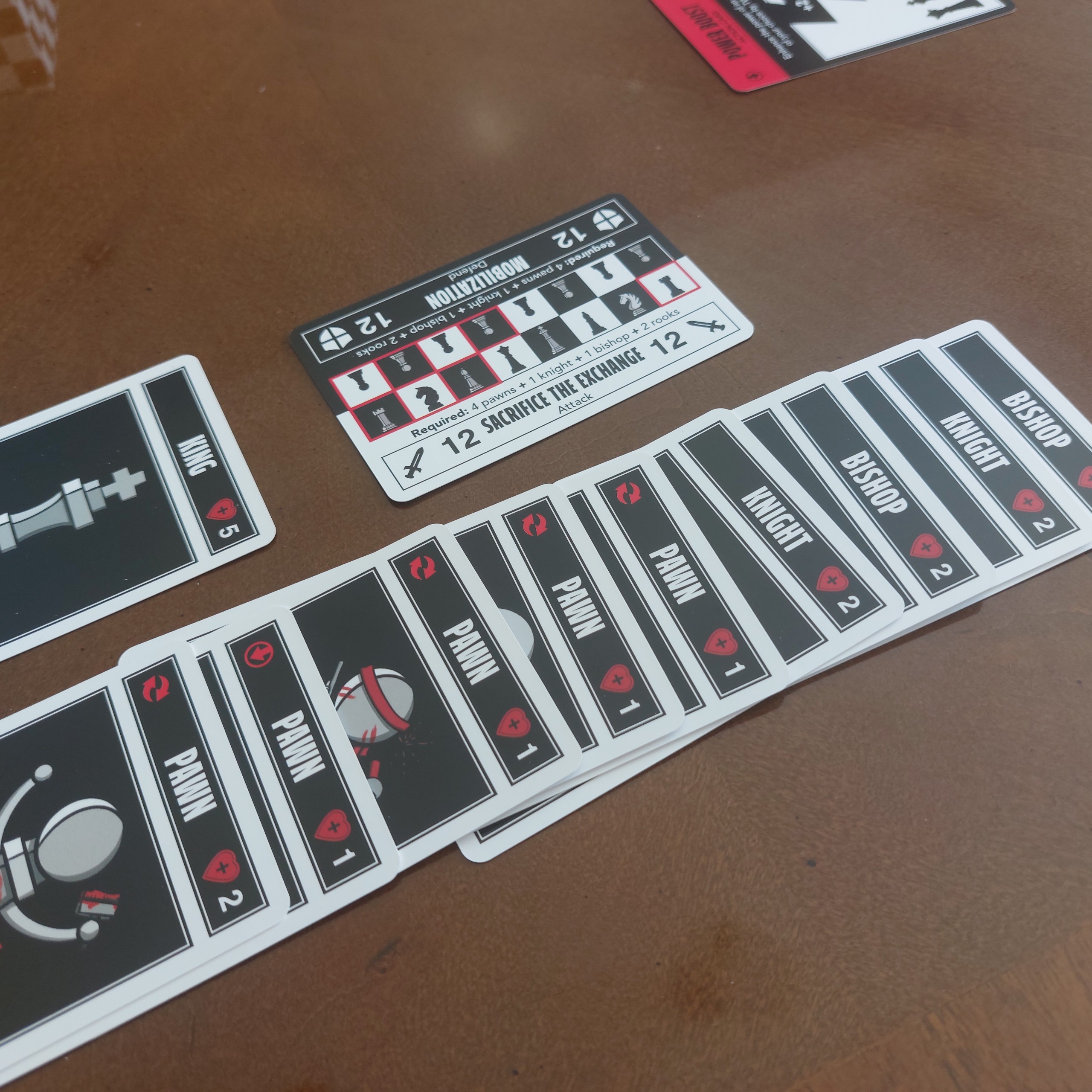 To play an attack card, you need to have the pieces if your army as specified on the card. Your opponent then has the opportunity to play a defense card, and they must play a defense card if they can. I’m not sure on the must, but it works, i guess its to prevent intentional sacrifice of pieces? Afterwhich, you compare attack and defense values, with a stalemate meaning everyone loses all their mobilised pieces and attack and defend cards. When a player loses, they lose hit points equal to the power value on the attack or defend card, each unit has a hit point value and the total hit point value discarded must equal or be greater than the power value. Meaning if you’ve only got super strong units and lose a battle, you could find yourself losing those vital pieces of your army as you forgot your cannon fodder! But herein lies my first rules ambiguity, one section if the rulebook refers to losing mobilised pieces, another part refers to losing pieces ensuring their hit point value equals the power value of the attack or defence. I’ve assumed it’s the later and we just lose pieces rather than mobilised pieces.